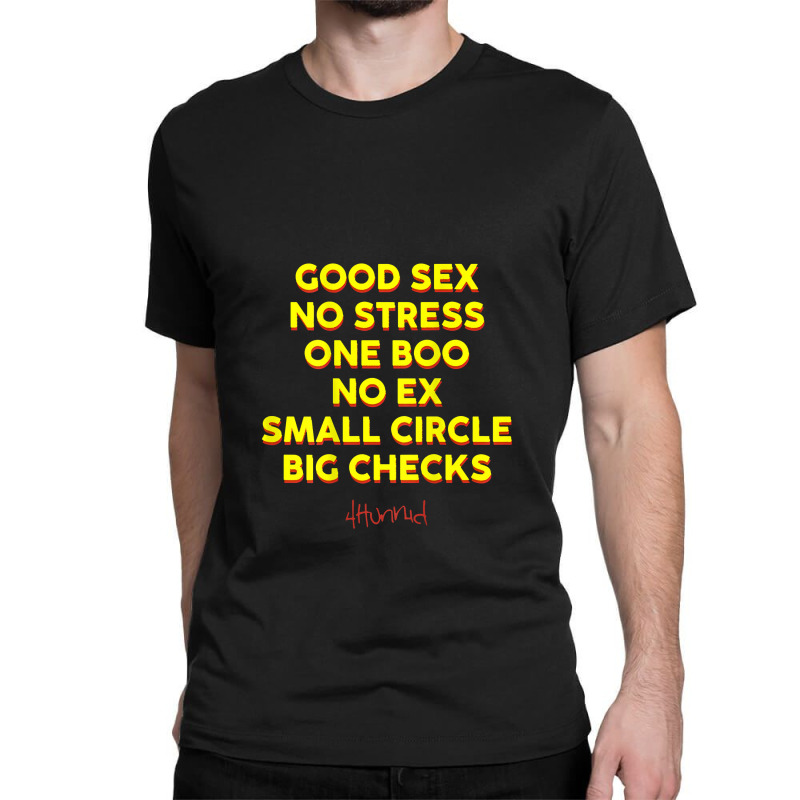 Embrace tranquility and financial success with our “Good S.E.X. No Stress One Boo No Ex Small Circle Big Checks” Classic T-shirt. This stylish tee blends comfort with a bold statement, perfect for those who value peace and prosperity. Crafted from premium cotton, it offers a soft touch and a relaxed fit for everyday wear.