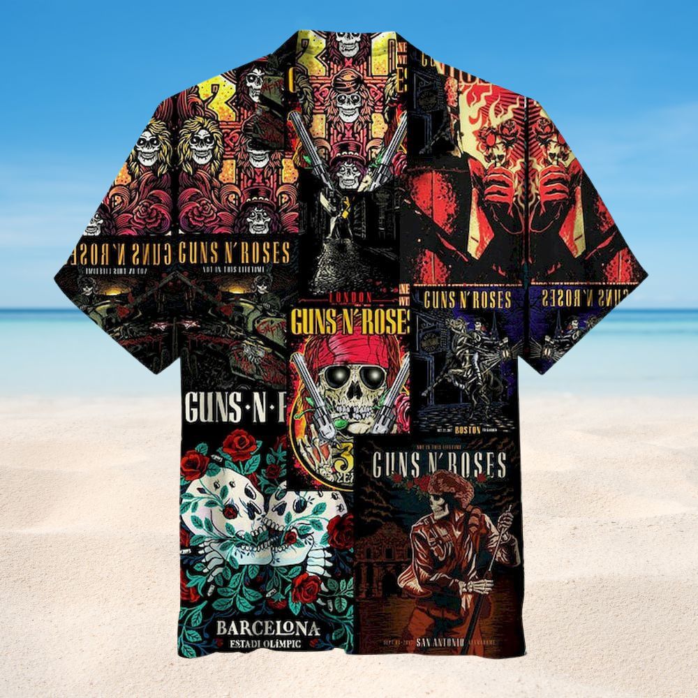 Elevate your wardrobe with the iconic Guns N’ Roses Concert Tour Collage Hawaiian Shirt. This vibrant shirt showcases a unique collage of legendary tour moments and designs, making it a must-have for any rock enthusiast. Stand out in the crowd and express your love for the legendary band in ultimate comfort and style.